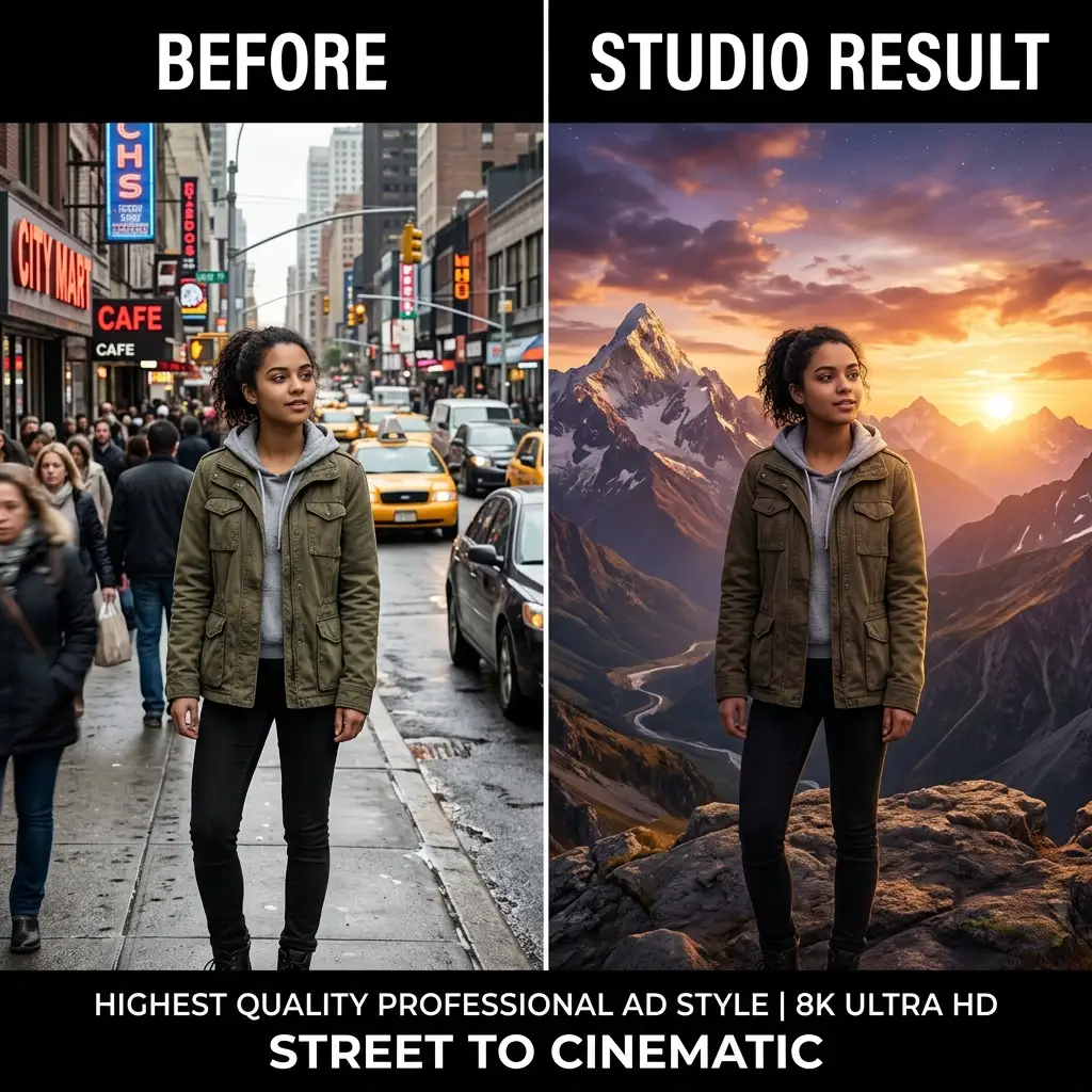 "Search millions of backgrounds, drop your subject, and compose. Transform a casual portrait into a breathtaking high-fashion piece or social content instantly."
